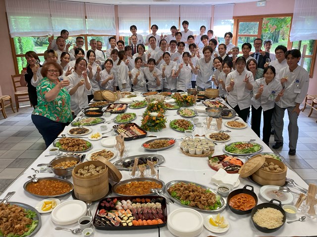 修了式の後はビュッフェパーティーが行われました。フランス校ではここまでフランス料理漬けの生活でしたが、今回はアジアな料理が並びます!!「これからはばたく皆さん、頑張ってください」の意味を込めてのパーティーです。準備は皆さんでしていただきましたけど(笑)素晴らしい料理が並び大満足でした。お菓子はフランス菓子ですが、こちらもみんなが大好きなお菓子が並びました!!