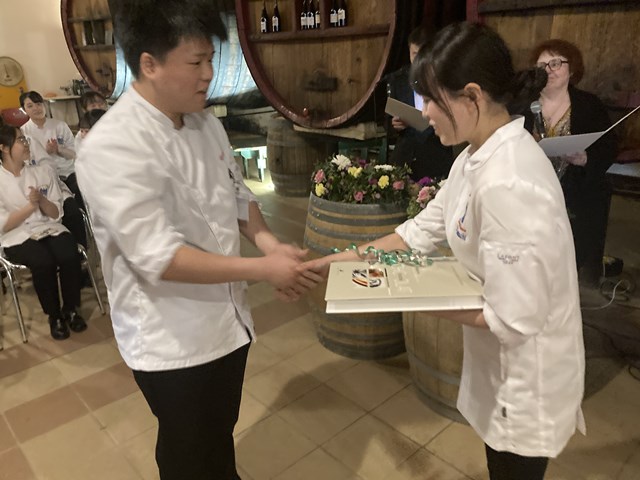 修了式では、まずディレクターのパディラック先生から祝辞があり、そのあと各賞の受賞が行われました。フランス語を特に頑張った人、サーヴィスの授業で成果を上げた人、いろいろな賞が贈られ、最後に調理、製菓の研究生一人ずつ最優秀賞が贈られました。