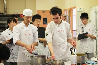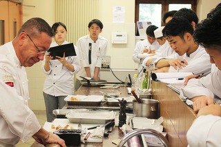 調理班では、5月13日(月)は、「ラ・ピラミッド」のシェフのパティシエ氏が外来講師として来てくださいました。 研究生たちはシェフのデモンストレーションでは学ぶことが多く、内容にも大満足でした。