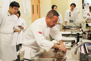 5月14日(火)、ルジエ社のカイエ氏が外来講師として来てくださいました。カイエ氏はフォアグラについて その歴史や作り方などをまで説明し講習の後には試食も行いました。 そのあとカイエ氏と研究生たちは一緒にフォアグラの料理を何品か作りました。