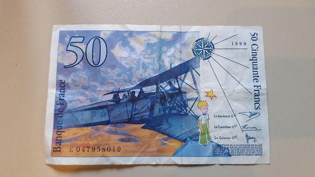 ユーロになる前に使われていた紙幣、フランの50フラン札です。サン-テグジュペリの肖像と星の王子様が描かれています。