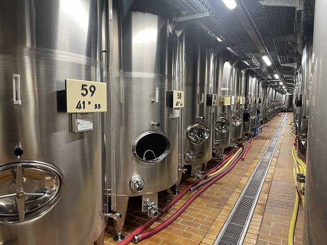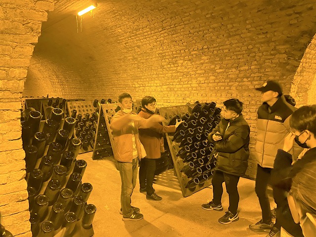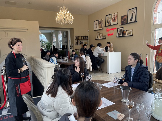 ゴセ社に到着した後は、会社の歴史やゴセ社のシャンパーニュのポリシーなどを含めてのシャンパーニュ醸造法の勉強や、シャンパーニュというワインの特色を、試飲をしながら学びました。醸造用タンクに機械や樽、たくさんのボトルなども見学し、「シャンパーニュが作られる過程」もイメージしやすかったと思います。