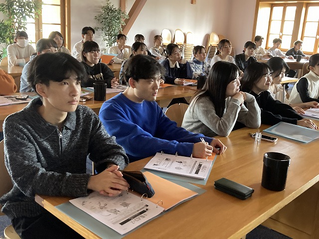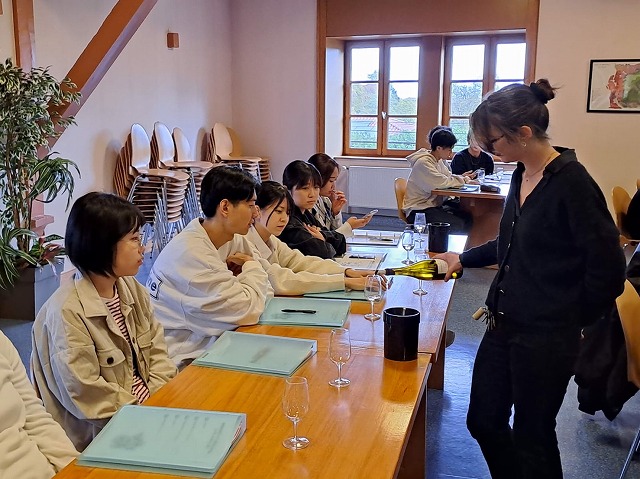 シカレックス社のファニーさんにワインについての簡単な授業を行ってもらいました。フランスのワインの生産量について(世界比など)、ブドウ品種、ブドウの栽培について、ワインの醸造方法など、ワインについて一通りのことを学ぶことができました。ボジョレワインは「ボジョレヌーヴォー」で有名ですが、目下そちらのワインを醸造中でシカレックス社も忙しいようです。