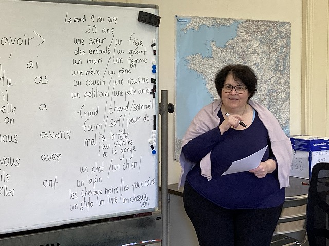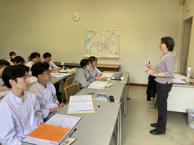 フランス語会話の授業はブリジット先生が担当です。上手な日本語を使って教えてくれます。文法を派生させて実習に使う会話につなげていく授業はとても便利です。語学は使うだけ上手になりますので、ブリジット先生の授業ではできるだけ自分で発言できるような機会を作ってくれます。恥ずかしがっている人にも容赦なく質問がとびます(笑)。研修に出ても会話をする、ということに慣れていればコミュニケーションがより簡単になります。頑張りましょう!