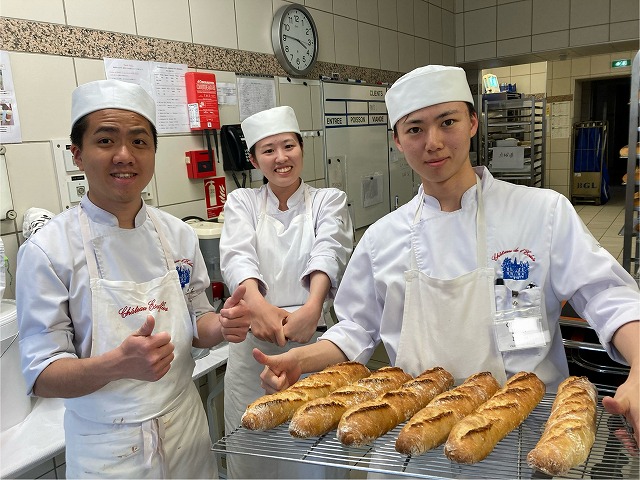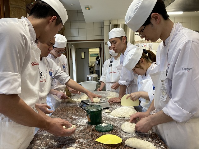 製パンの授業ではフランスパンをはじめとしたハードパンを中心に実習を行いました。レストランによってはパンも自家製を出しているところもありますが、将来的に自分のお店を出す際にパンも作れたらいいな、と思っていた人たちにとってイメージが沸く授業になったのではないでしょうか。かなり力が必要だったり、体力勝負でもあるパン作りです。班ごとに力を合わせてパン生地をこねていろいろなおいしいパンができました!フランス校のあるボジョレ地方ならではとも言える「ワインとソーセージ入りのパン」もありました。形もソーセージに似ていて味もとてもおいしいです!!