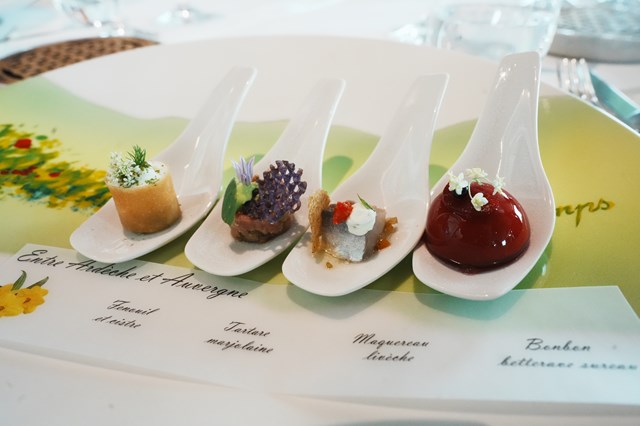 メゾン・マルコンがあるのはシャトーから車で2時間ほどの、オート・ロワール県にある山の上です。朝シャトーをバスで出発し、山頂を目指して上りました。ミシュランガイド3ツ星獲得の基準が「車に乗ってでも出かけたいレストラン」ということもあり、まさにこのレストランも公共交通機関で行くにはなかなか難しいロケーションですし、人気があるため予約を取るのも難しい名店ですので、学校での企画は嬉しいです!山頂に上がる途中にある村で一休みしましたが、こちらもメゾン・マルコン関連のお店も多く「マルコン村」という感じがします。山頂に到着すると素晴らしい景色の広がる中にレストランはありました。