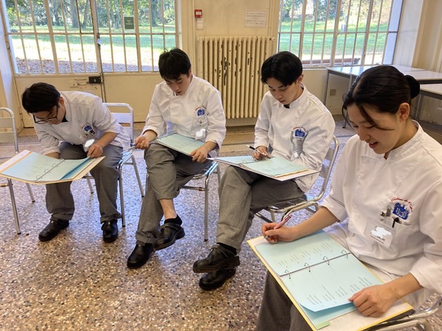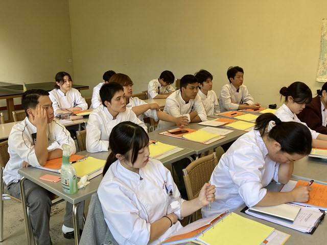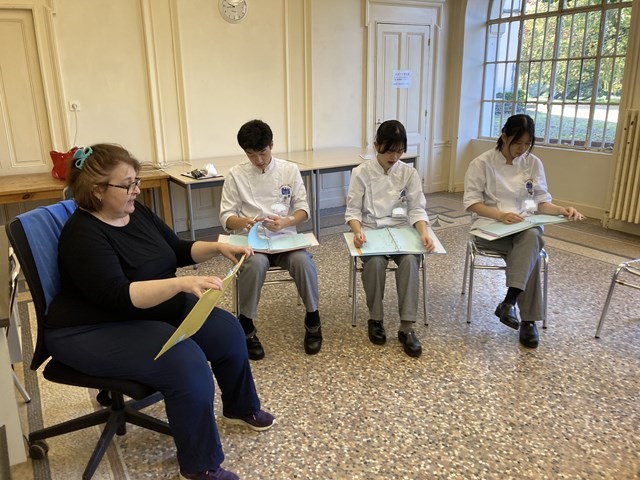 今回はフランス校の実習授業と並行して行われているフランス語の授業を覗いてみました。実習授業を行うにあたってテクニックはもちろんですが、フランス語もとても大切です。フランス校のフランス語授業は文法と会話の授業に分かれ二人の先生が担当しています。文法担当はシルヴィ先生、会話担当はブリジット先生です。