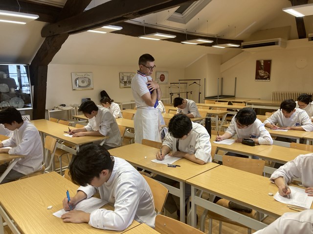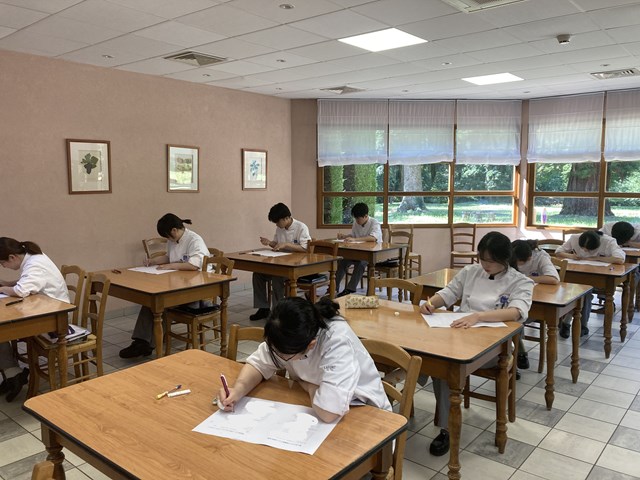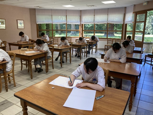本日は調理製菓の研究生が前期筆記試験を受けました。筆記試験はフランス語に関する質問で構成されていますが、調理製菓実習に関する試験とフランス語の文法会話に関する試験の2種類があります。すでに実技試験は終了しており、本日の試験で前期試験は終了、さわやかに夏休みを迎えることができます(笑)。