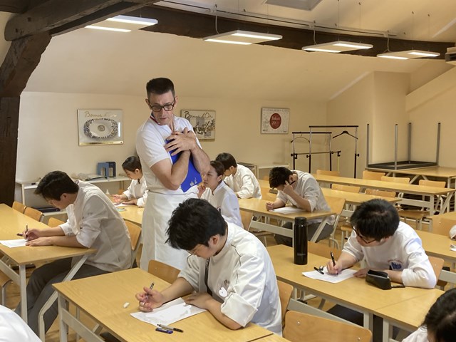調理製菓の筆記試験は実習に使うフランス語を問う試験で、ナレ先生とドゥムール先生によるフランス語読み上げを聞き取って答える「ディクテ」があります。器具や材料の名前から動詞や短い文章などを聞き取って答えます。普段から先生方のフランス語を聞き生活していますが、今回はどれだけ聞き取ることができるようになったかの試験です。思ったよりできた人、難しいと思った人、いろいろな反応がありました。