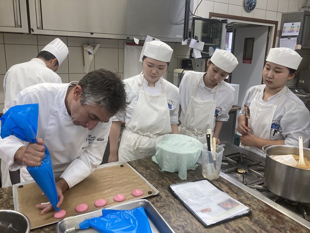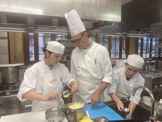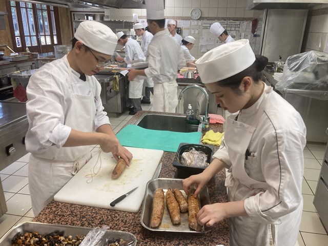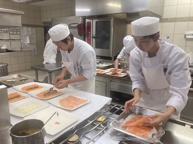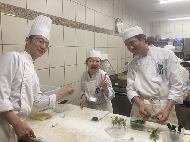 調理は前菜とメインの2皿、製菓も2種類のお菓子を作って提供します。調理は日本の学校とは変わって仕込みから全て自分たちで行うので食材の量が多い!!時間以内に裁くにはスピードが必要になります。これは研修に出た研究生からもよく聞く話で「現場はとにかくスピード!」。もちろん丁寧に行う必要もありますが、お客さんをお待たせしてはいけませんし、温かいものを温かいまま出す、といったことも重要です。研修に出ることを希望している研究生が多いのでそれまでの訓練とも言えますが、時間以内に段取りよくできるようになってくると達成感も大きくなっていくと思います。慣れるまではしばらく大変かもしれませんが、頑張っていきましょう。