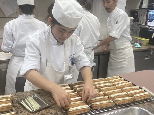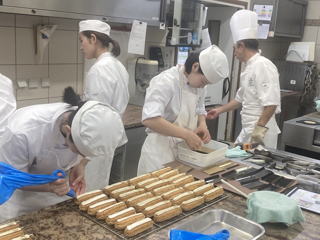 製菓もたくさんの材料を仕込みたくさんのお菓子を作ります。一つ一つ細部も同じ形に、大きさも同じに作らないといけません。先生がやり方を見せてくれるとさらっとやっているように見えますが、実際に自分でやるとなかなか難しい、ということも多いようです。同じ班のメンバーと協力しあって効率よくお菓子を仕上げていかないといけませんのでコミュニケーションも大切になります。きれいでおいしいお菓子を作れるように皆さん頑張っています。