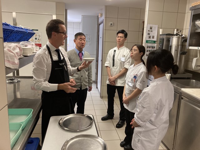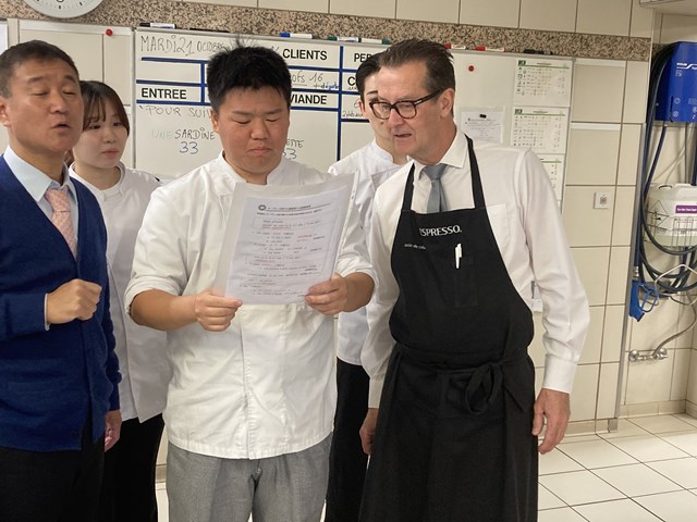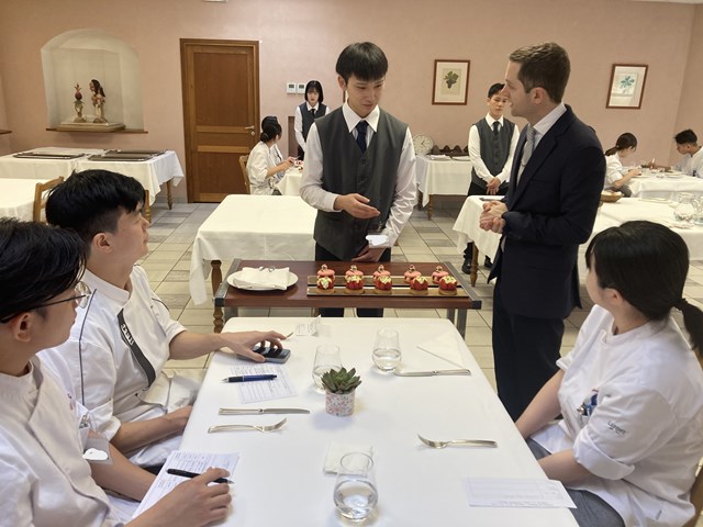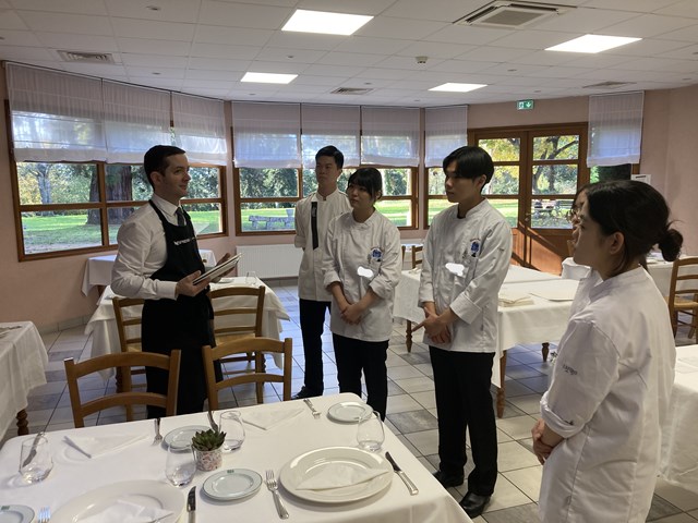 フランス校のシミュレーション実習授業が始まり1週間強が経ちました。毎日調理、製菓の授業が行われますが、フランス校ではここにサーヴィスの授業が加わります。調理、製菓の実習の時間は同時にフランス語の授業とこのサーヴィスの授業が行われ、日によって担当は変わります。フランス校で初めてサーヴィスにかかわる研究生も多いですが、なかなか好評な授業です。