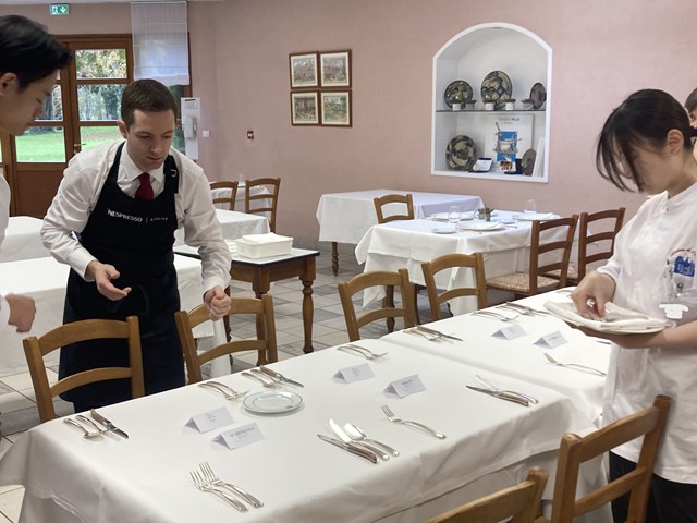 サーヴィスの授業はテーブルセッティングやお皿をきれいにしたりするところから始まりますので、お客様にお皿を出すだけではありません。テーブルセッティングもフランスのレストランサーヴィスの内容に従って行います。ナイフやフォークも料理ごとに違ったり、覚えることがたくさんありますが、フランスに来てこそ知ることができる内容も多く興味深いです。