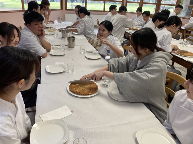フランス校では本日ガレット・デ・ロワをみんなでいただきました!中にはフェーヴと呼ばれる小さな陶器が入っており、それを当てた人には王冠が贈られました(紙製ですけども)。切り分ける時にフェーヴに当たらないようにするのがなかなか難しいですね。