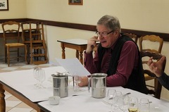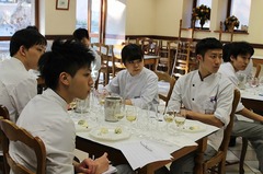 ワインの授業は「ワインと食べ物との相性」の授業です。フランスの「最優秀ソムリエ」の称号を受けたことのあるアラン・ロジエ先生に来ていただき、ワインと食べ物との相性についての授業をしていただきました。好みというのは人によりますし、ワインを飲むときのコンディション(空腹か満腹か、朝なのか夕刻なのか等など)にも変わってきますので「正解はありません」とのこと。自分が感じたことを信じて楽しくワインを味わうための授業でした。