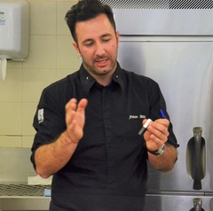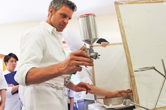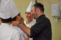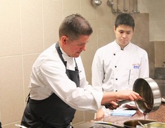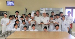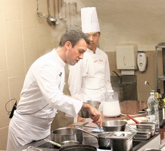 調理の外来講習もありました。5月10日(火)、Charollesシャロルという町にある「Hotel de la poste」のDoucet氏がエスコフィエ校で学生達に自分の料理について教えてくれました。今はDoucet氏のレストランにはエスコフィエ校の研修生が働いており一緒にシャトに来て講習のアシスタントをしました。