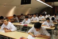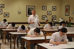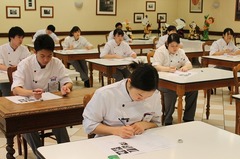 調理と製菓のフランス語試験は普段の実習で使うフランス語中心に問題が作られています。コアール先生とキャメラ先生が読み上げたフランス語を聞き取り答えるものもあります。シャトーに到着してから2か月程でどのくらいフランス語力が上がったかの確認です。