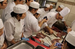 1月23日(月)、調理班はナレ先生による「ジビエ」についての授業を受けました!ナレ先生が学生の目の前でジビエを切り分け、道具や部位について解説してくださいました。