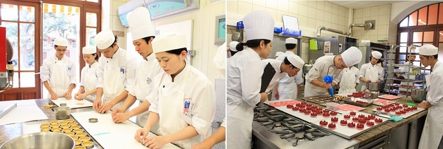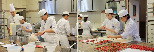 製菓の研究生も同様に、これから目指していくプロの現場に近い状況で技術・スピード・効率の良さを身につけていきます。シェフが見せてくれる技から目が離せません。