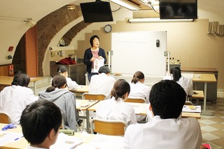 フランス食文化講座では、リヨンとその周りの地方についてでした。事務室の松本先生がリヨンの食文化の説明をし、研究生はリヨンの伝統的な食べ物を試食しました。