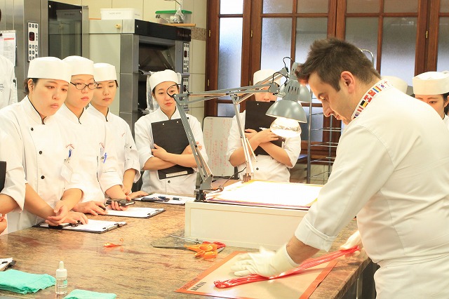 製菓は世界中でアドバイザーとして活躍されているジェローム・ランジリエ氏が来校、2日に渡りアメ細工の講習を行ってくださいました。