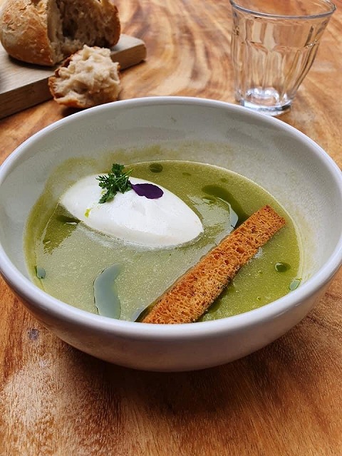 グリーンゼブラというトマトのガスパチョ、ヤギチーズのムース。冷たいガスパチョはテラス席に合いますね。