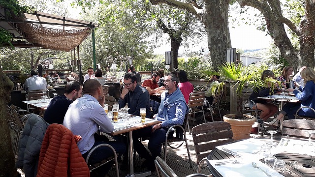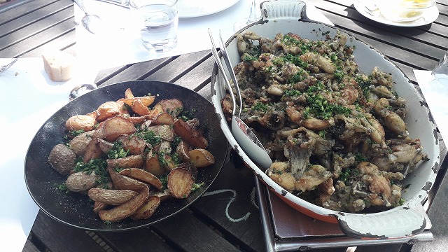 ニンニクとパセリがたくさんかかっていて、香りからしておいしそう、そして食べるとやっぱりおいしい!魚や鶏肉のようだと形容されますが、肉自体はさっぱりしたものです。こちらを青空の下で冷えたビールやロゼワインと一緒にいただくのは至福の時ですね。