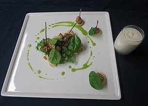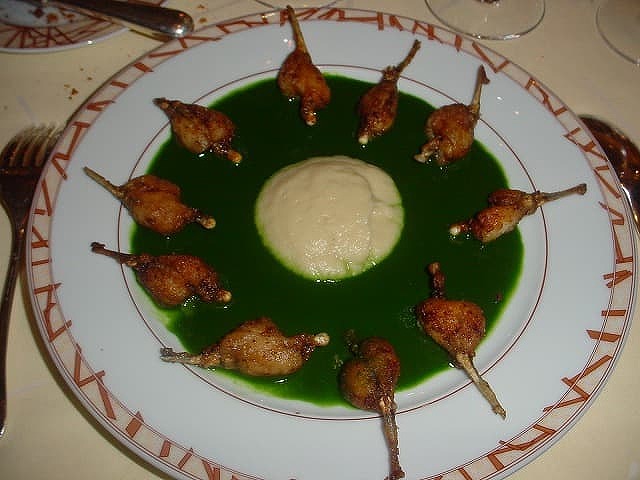 カエル肉は高級食材として扱われており、ミシュラン星付きレストランでも使われます。フランス校の調理実習メニューでも使われます。フリチュールは大皿に盛られて出てくることが多いですが、星付きレストランで出されるカエル料理はやはりお上品なものが多いです。
