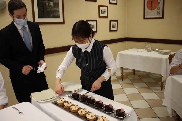 サービス班はフランス料理研究課程・製菓研究課程のどちらでも同様に学ぶため、もちろん製菓を学びに来た人もデクパージュの授業を受けることができます。