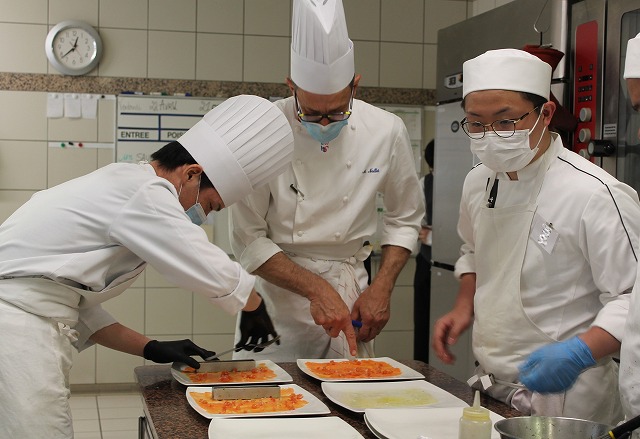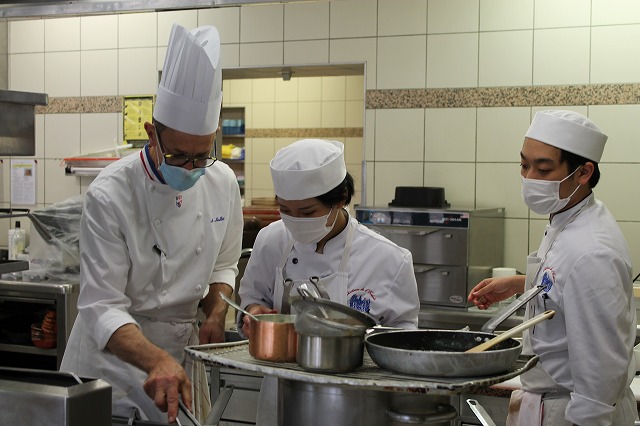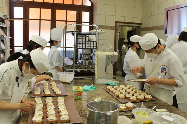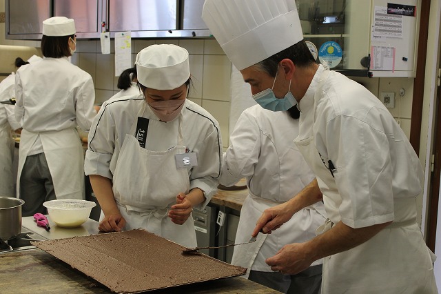 ガイダンス期間に各フランス人シェフによる講習授業を受け、どのように料理やお菓子を作るのか学びました。それを実際に再現するわけですがかなり高度なテクニックが必要になってきます!同時に食材や道具は全てフランス語、やり取りもフランス語、という流れの実習、初めは少し戸惑うかもしれませんが、慣れてくると理解できたりうまくできたり楽しいことが増えてくるのでひと踏ん張りですね。