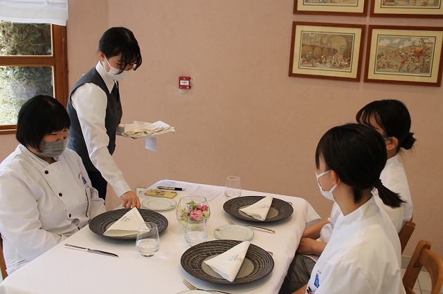 シミュレーション実習は調理製菓の授業に加えてサービスの授業もあります。