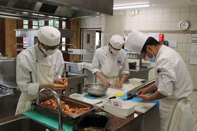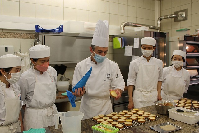 調理1セリはオードブル、魚料理、肉料理が一皿ずつの実習ですが、2セリになると各2皿、合計6皿をクリヨン(clientお客様)に提供します。製菓は1セリではプチガトー(petit gâteau切り分けるサイズではない小さなお菓子)を学び、2セリからはグランガトー(grand gâteau切り分けるタイプの大き目のお菓子)に変わります。そしてプチフール(petit-fourお茶菓子)も加えられます。いろいろなタイプの料理とお菓子を学び、力を付けていく授業内容となっています。サービスの授業もセリごとに仕事量が増えたり内容が難しくなったりしていくので勉強することが多く大変ですが、それだけ学ぶことも多く充実した学校生活となっています。