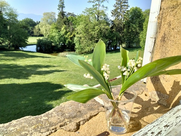 シャトーの庭を背景にスズランの写真を撮りました