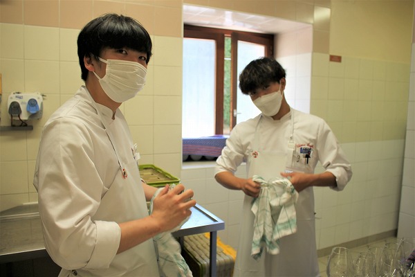 テーブルのセッティングをしたり、お皿やナイフ・フォーク類を磨いたり、グラスを磨いたり、どれも初めてのことばかりですが、皆さん1回経験すると、どんどんスピードが上がるのはさすがです!