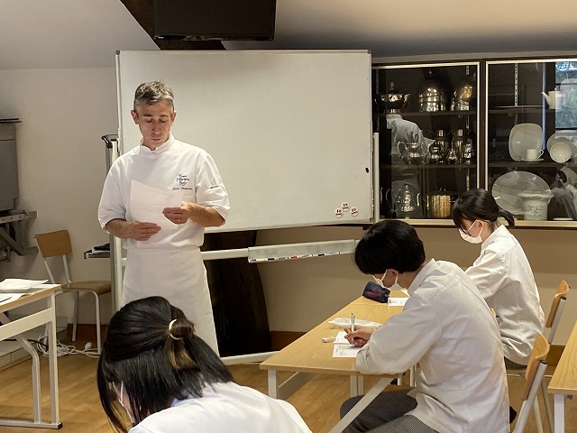実習に必要なフランス語は調理、製菓フランス人シェフによるフランス語読み上げ試験もあります。普段の授業でフランス語の聞き取りが必要になりますが、前期でどの程度聞き取れるようになったかの確認になります。はじめは「何を言っているのかわからない。汗」と言っていた研究生の皆さんも最近はある程度聞き取りができるようになってきたので普段の努力の成果が出たのではないでしょうか。