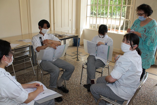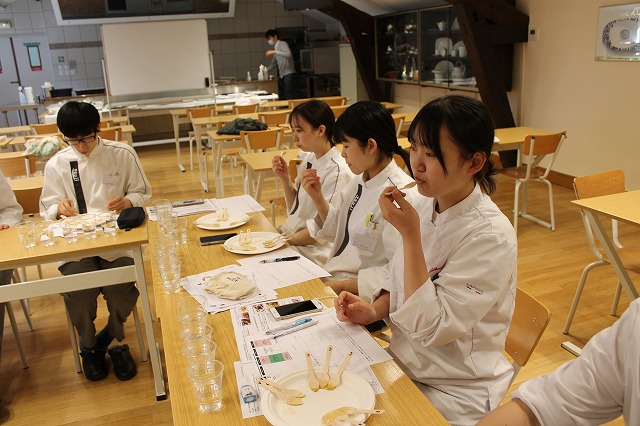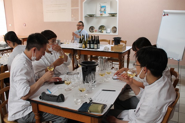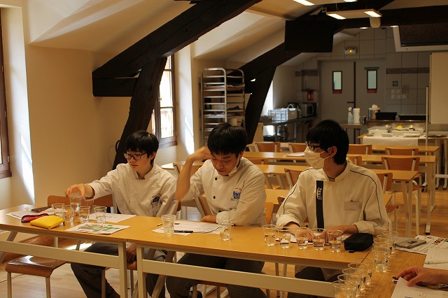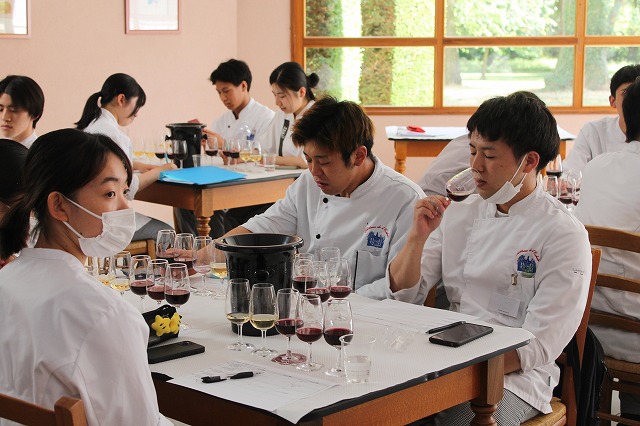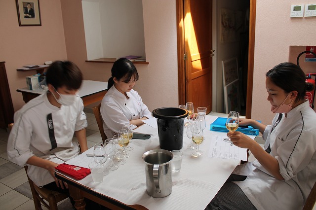 ワインの授業は「ナチュラルワイン入門」でした。近年有機栽培のブドウで造った「ビオワイン」が流行していますが、ナチュラルワインは有機栽培のブドウを醸造や瓶詰めなどの過程でも添加剤を一切使わず、なるべく手を加えないように作っているワインです。1970年代からすでにナチュラルワインは存在しており、「流行りものではない」とのこと。いわゆる普通のワインとは違った造り方をしているので、味も香りも独特ですが、その独特さを好む愛好者もいいのです。研究生の皆さんも「うわー、すごい香り」と言っている人もいれば「私はこれ好きです!」と言っている人もいて様々でした。