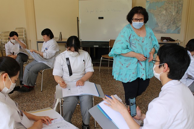 食文化の授業は「フランスの行事カレンダー」を食に絡めて紹介しました。フランスには宗教的な祭日や行事が多く、そこに食べ物が関係することも多いです。その歴史やイベント、食べ物の紹介がありました。これから始まる夏休みにも「フランス革命記念日」のパレード等、旅行先で見られるものもあります。他には「フランスの水」「フランスのハチミツ」の味比べを実際に試食しながら学びました。フランスは水を購入して飲むことが多くいろいろな種類があります。日本人向け、そうでないもの様々な味があります。ハチミツも日本での印象よりも種類が多く、こちらもいろいろな味があり興味深いです。