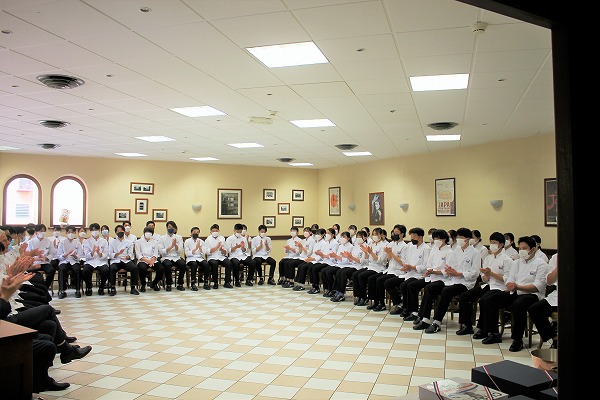 セレモニー後に、実習室前の屋外で乾杯をしました