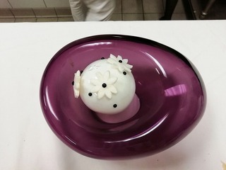 毎日の仕事の最初はプティ・フールとして出されるお皿の準備から始めます。パート・ド・フリュイやショコラ、ボンボンを盛り付けます。それから先輩に今日する仕事内容を聞いて、準備して初める、という感じでデセールとして出すガトーの仕込みをします。私の担当する仕込みは、飴細工、フルーツカット、メレンゲを転写シートに薄く伸ばす仕事をはじめ多種多様です。特に飴細工は大きさや形を揃えるのが難しく今でも苦戦しますが、シェフや他の方からも褒めて貰えるので今では好きな仕事です。研修当初から現在までの仕事内容はあまり変わっていませんが、今ではガトーの完成度も上がって、飴細工とメレンゲを扱う仕事は任されるようになりました。