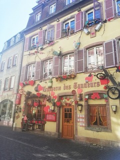 アルザス地方のRIQUEWIHRリクヴィルという美しい町にあるレストランです。観光地ということもありいろいろな国、世代のお客様がいらっしゃいます。赤を基調とした内装で客席は最大40名ほど入ると思います。