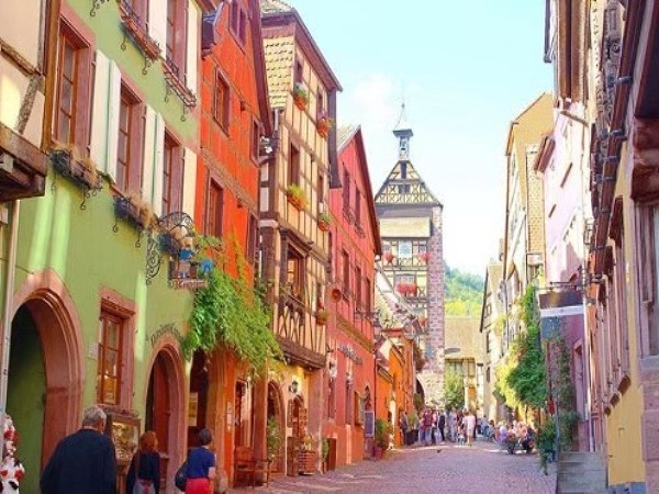 古い町並みのなかに突然だまし絵の壁があったりするドール(写真上)もいいですが、その中でも私がいちばん好きな村がアルザスのリクヴィルRiquewihrという村です(写真下)。ワインの産地にあるおとぎの国のような~カラフルな街並みの村で、うっとりするほど魅力的です。
