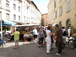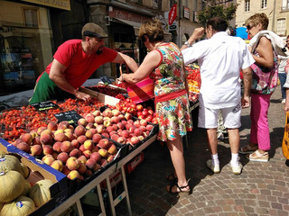 日曜日にマルシェがひらかれているのでよく仕事が終わったと後に行きます。沢山の人が買い物に来ていてよく音楽が演奏されていたりもするのでとても賑やかです。そこで様々な季節のフルーツや野菜等を見たり買ったり、休日にはパティスリーに食べ歩きに行ったりしています。近隣のモンテリマールMontélimarやヴァランスに行ったりもしました。ヴァランスに『ピックPic』と言う女性シェフがされている3ツ星レストランがあるので、近くで研修している友達と食べ歩きに行きました。どの料理も非常に繊細で素晴らしくとても感動しました。日曜日に行ったのでシェフには会えないかも知れないと思っていたのですが会うことができたのでとても嬉しかったです。