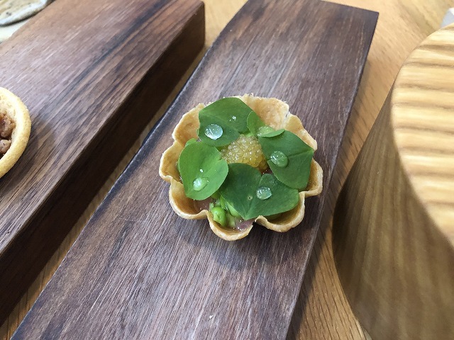 薄いパイ生地にグリーンピースを塩ゆがきしたものと、そのピュレ、エシャロットのピクルス、カワカマスという魚の卵、オキサリスの葉が乗っています。