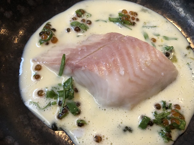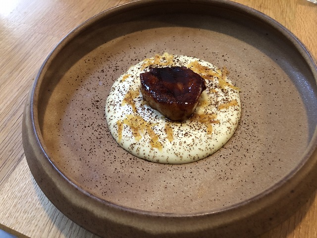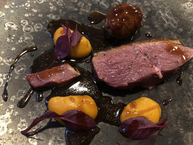 オンブルシュバリエ(アルプスイワナ)を低温調理し、オゼイユという酸味の強い葉とそのピュレ、マスの卵を飾っています。ソースはブールブランで魚料理としては定番のソースです。ここまでの料理もそうでしたが、全般的に酸味をかなり効かし攻めた料理を出されている感触です。ただ、この料理もソースに使われているバターの甘味でうまくバランスを取っており、シェフのバランス感が素晴らしいと感じました。