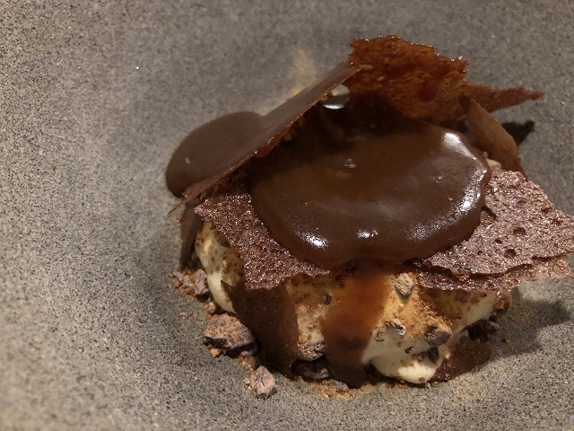 イーストを焼いたもの、キャラメルソースや、チョコレートのチュイル、ソバのパウダーなどが使われたデザートです。