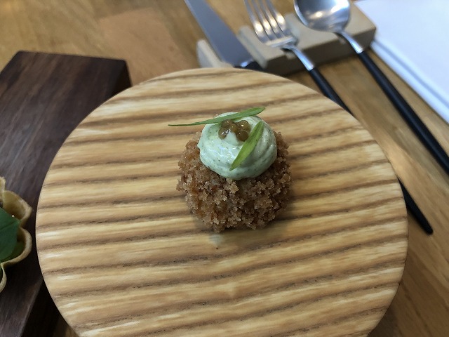 リヨン丘陵地帯のエスカルゴと鶏肉をクロケットにし、エストラゴンのマヨネーズとタスマニアマスタードを添えてあります。臭みのないエスカルゴに酸味の効いたマヨネーズがとても合っており爽やかなクロケットです。