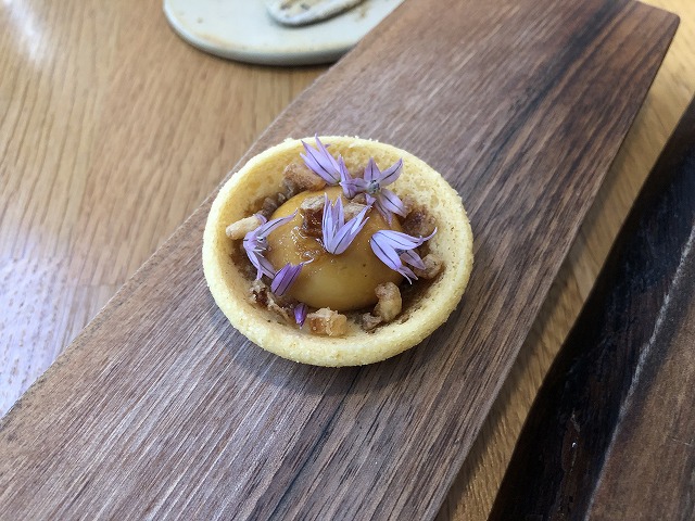 この小さなパン粉を使ったタルトの中にリヨンの伝統料理のスープ ア ロニョンが構築されています。中央にはスープ ア ロニョンにベジタブルゼラチンを加えて膜にし、コンテチーズのムースを包んでいます。周りには玉ねぎのフリットとシブレットの花が添えられています。