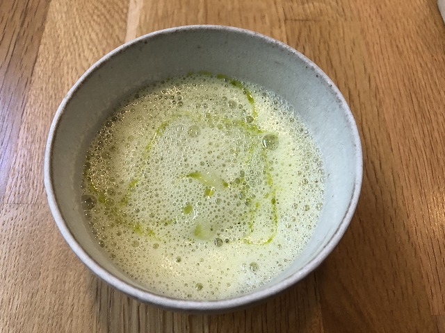 グリーンアスパラとヴェルヴェンヌ。ヴェルヴェンヌとアブラナの油を乳化させた泡の中には、グリーンアスパラで作ったソルベと生のアスパラのタルタルが隠されている。ヴェルヴェンヌの泡はレモンの香りが淡く香り、軽く甘みがあり、中のアスパラの苦みとの相性が抜群です。暑くなってきたこの時期にピッタリ。
