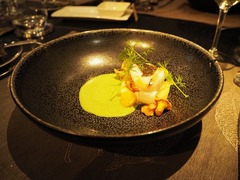 季節のセップ茸を香りよくソテーし、にんにく、パセリを加えた柔らかい生地を付け合わせに、ゆず胡椒がアクセントに添えられています。