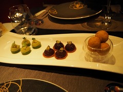【写真左】アミューズきゅうりとオリーブのムース、ブーダンノワール、ルブロッションのコロッケ